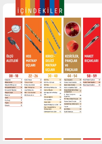 Kumpaslar 8 Siyah / Beyaz 22 SDS Plus 30 Flap Zımparalar 44 Metal Maket Bıçakları 58 Yıldız Bits Uç 62 Torna Aynaları 70 HSS Standart Parmak 82 A - Silindir Düz 90 HSS 3’lü El Takım Kılavuzu 94