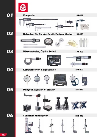 Kumpaslar 184-192 Cetveller, Diş Tarağı, Sentil, Radyus Mastarı 191-195 Mikrometreler, Ölçüm Setleri 196-203 Komparatörler, Salgı Saatleri 204-209 Manyetik Ayaklar, V-Bloklar 210-213 Yükseklik Mihengirleri 214-216 182
